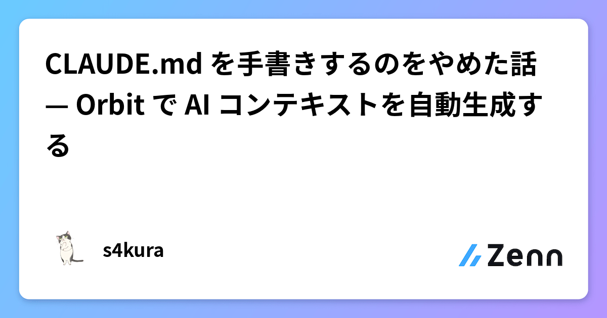 CLAUDE.md を手書きするのをやめた話 — Orbit で AI コンテキストを自動生成する 手書き CLAUDE.md、つらくないですか? Claude Code の CLAUDE.md、Cursor の .cursorrules、GitHub Copilot の copilot-instructions.md。 Zenn 15時間前