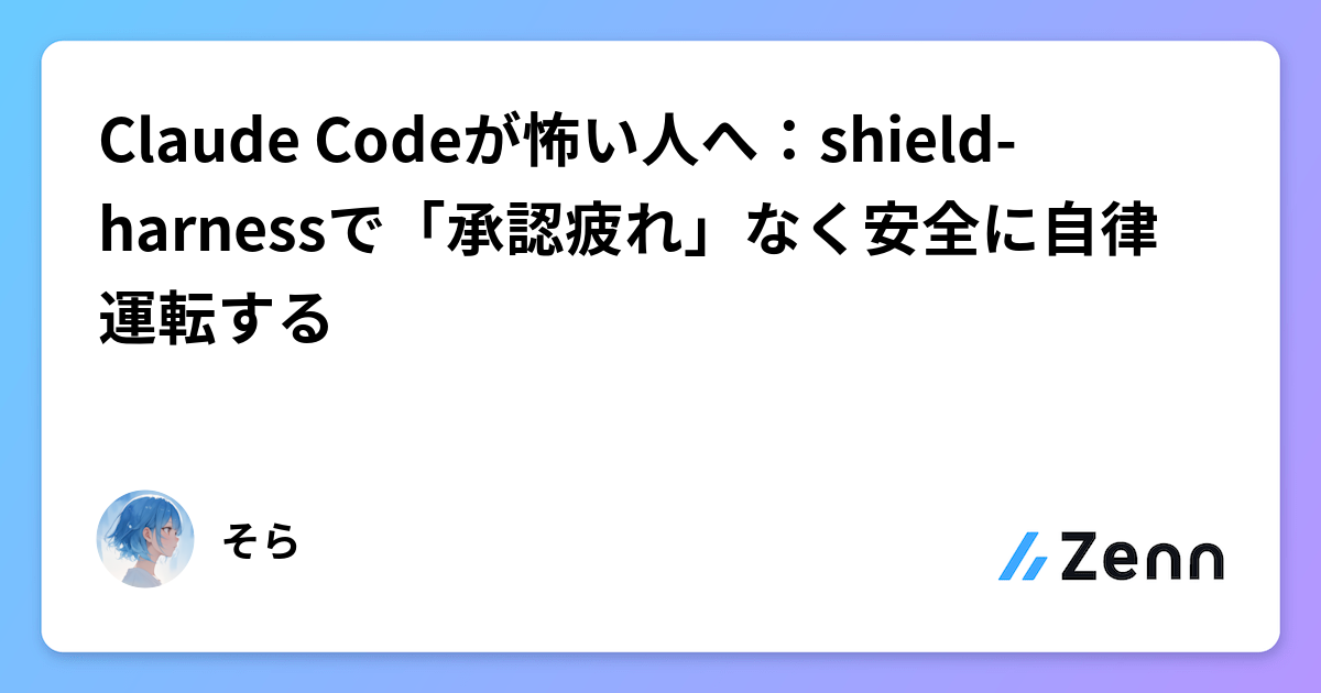 Claude Codeが怖い人へ:shield-harnessで「承認疲れ」なく安全に自律運転する 「許可しますか?」に疲れていないか Claude Code を使い始めて、最初に感じたのは便利さじゃなくて煩わしさだった。 「このコマンドを実行しますか?」「このファイルを編集しますか?」。何をするにも確認ダイアログが出る。最初は丁寧に読んで判断していた。 Zenn 9時間前