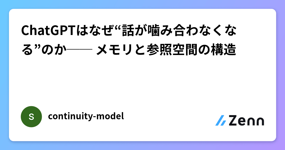 ChatGPTはなぜ“話が噛み合わなくなる”のか── メモリと参照空間の構造 ChatGPTのメモリは思考を壊すのか 例えば、こんな状況を考えてほしい。 あるチャットで「カラスは白い」という世界観の小説を書いたとする。 その世界では、カラスは白いのが前提だ。 次に、別のチャットウィンドウで 「カラスはなぜ黒いのか?」という現実的な話を始める。 本来、この2つの会話は独立しているはずだ。 Zenn 21時間前